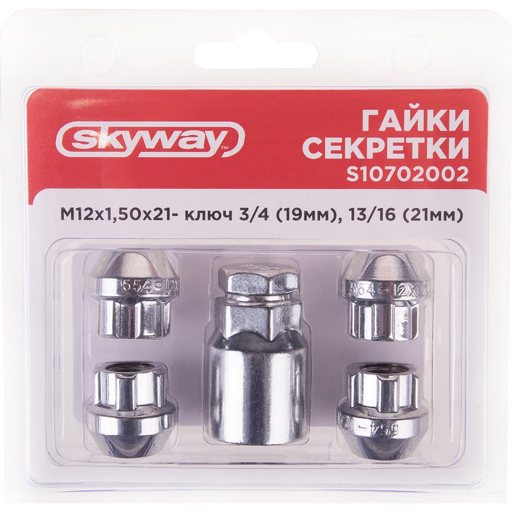 Гайки секретки M12x1.50, 21 мм, конус откр 5 луч 1 кл, хром 002, 4 шт SKYWAY S10702002