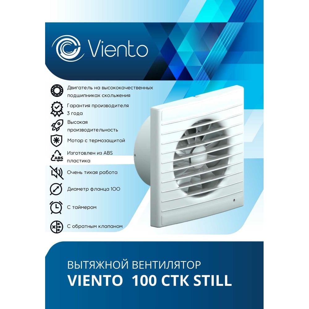 Осевой вытяжной вентилятор ВИЕНТО с обратным клапаном и таймером малошумный 100СТK STILL