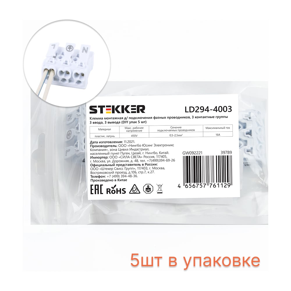 Монтажная клемма STEKKER LD294-4003, для подключения фазных проводников, 3 контактные группы (3 ввода, 3 вывода на полюс), 5 шт 39789