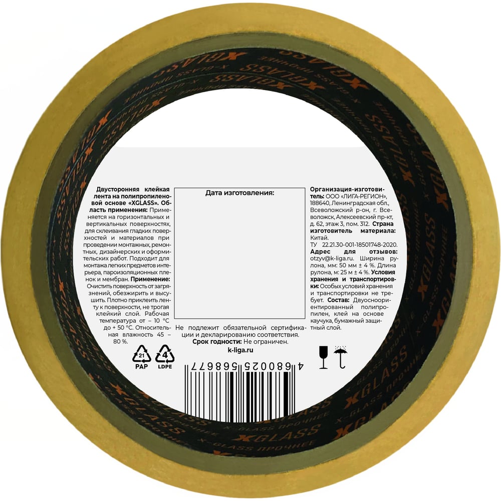Двухсторонняя клейкая лента X-Glass ПП, 50 мм, 25 м 160386