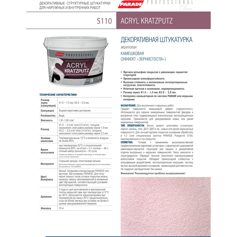 Декоративная штукатурка PARADE камешковая Professional Acryl KRATZPUTZ S110 K 2, 15 кг Лк-00008244