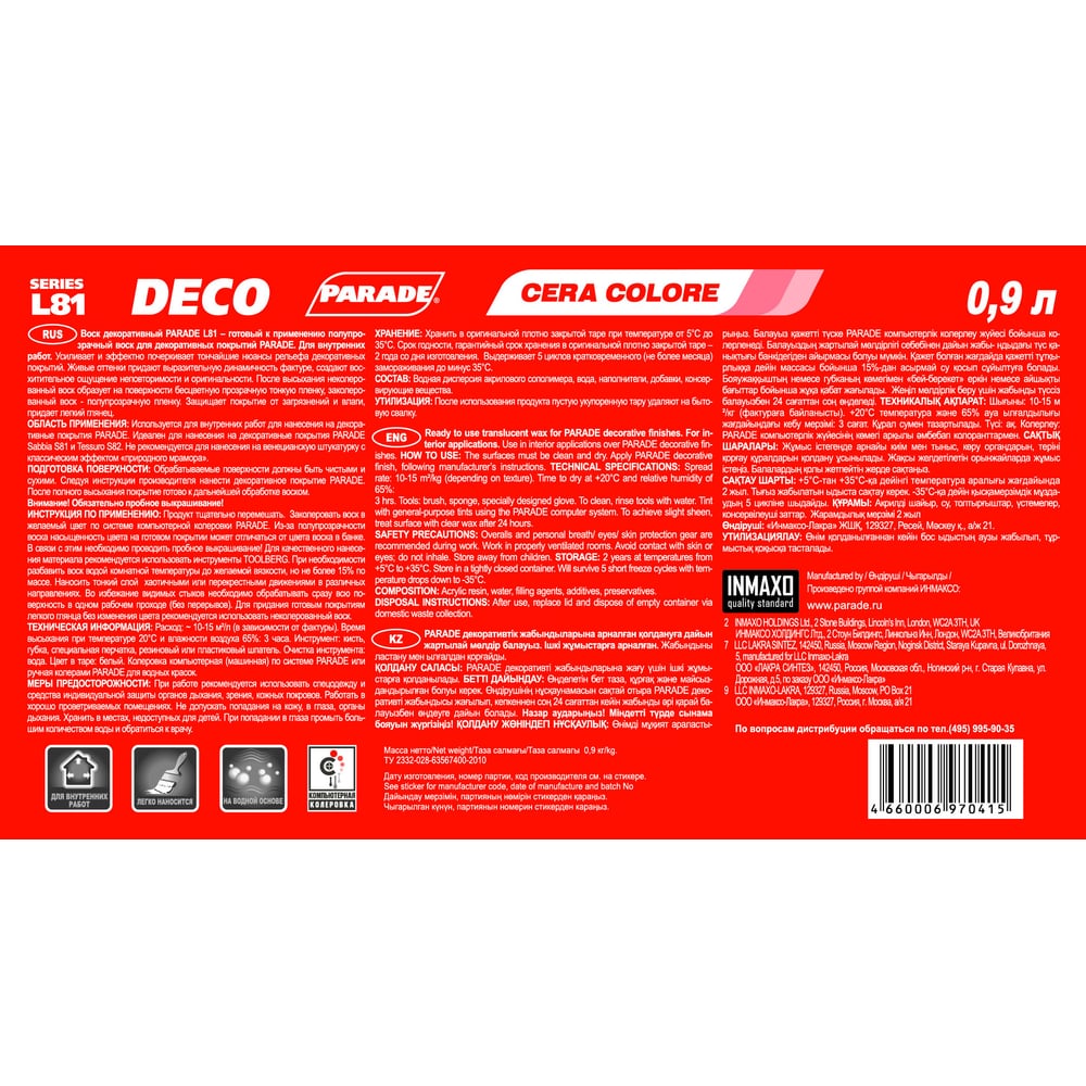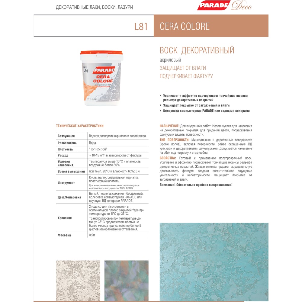 | Состав | водная дисперсия акрилового сополимера, вода, наполнители, добавки, консервирующие вещества. |