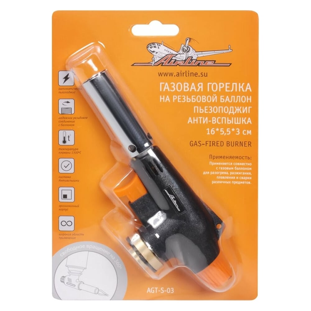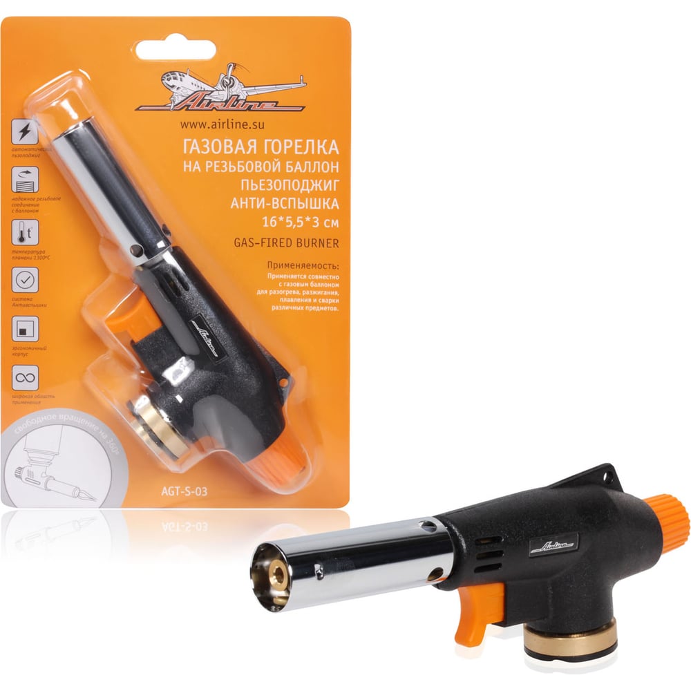 Газовая горелка Airline на резьбовой баллон, пьезоподжиг, анти-вспышка, 16х5,5х3 см AGT-S-03