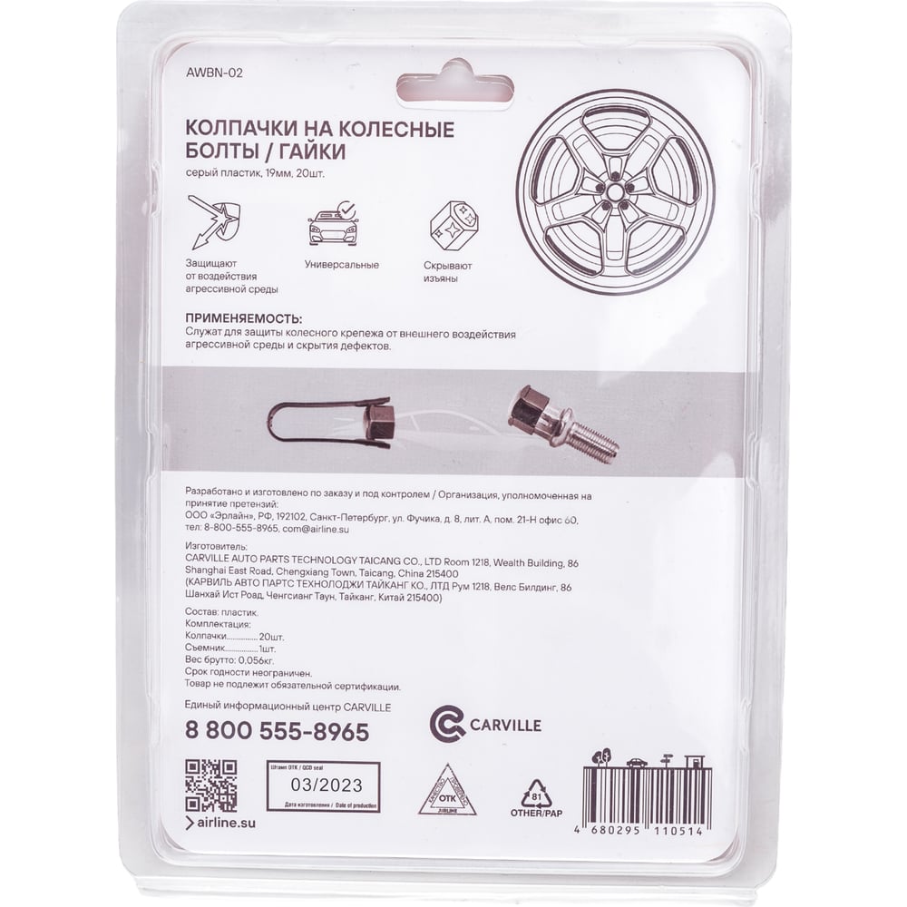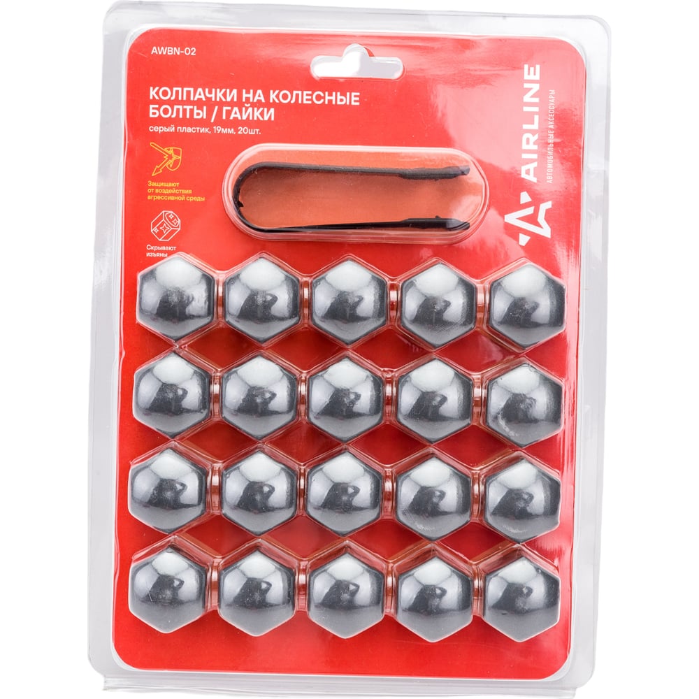 Колпачки на колесные болты/гайки AIRLINE 19 мм, 20 шт. + съёмник, пластик, серые AWBN-02