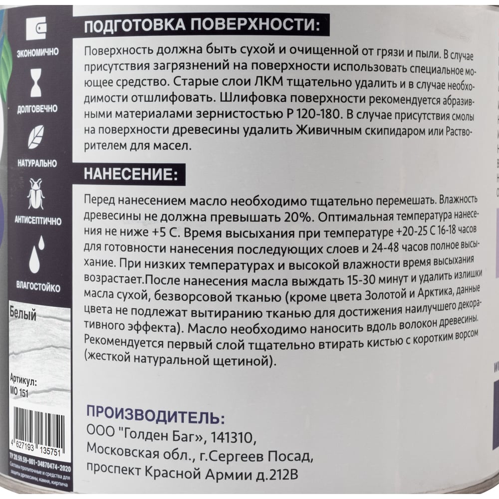 | Состав | льняное масло, оксидированное льняное масло, бентонит, воск пчелиный, воск карнауба, канифоль, скипидар живичный ( двойной очистки), уф-фильтр, диоксид титана, оксид железа, сиккатив (без свинца) |