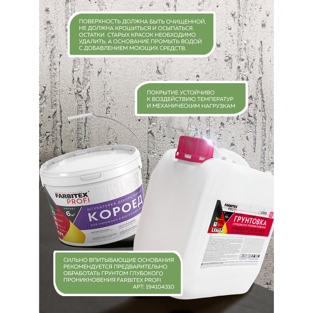 | Поверхность применения | бетон, цементные и гипсовые штукатурки, кирпич, поверхности, ранее окрашенные водно-дисперсионными красками |
