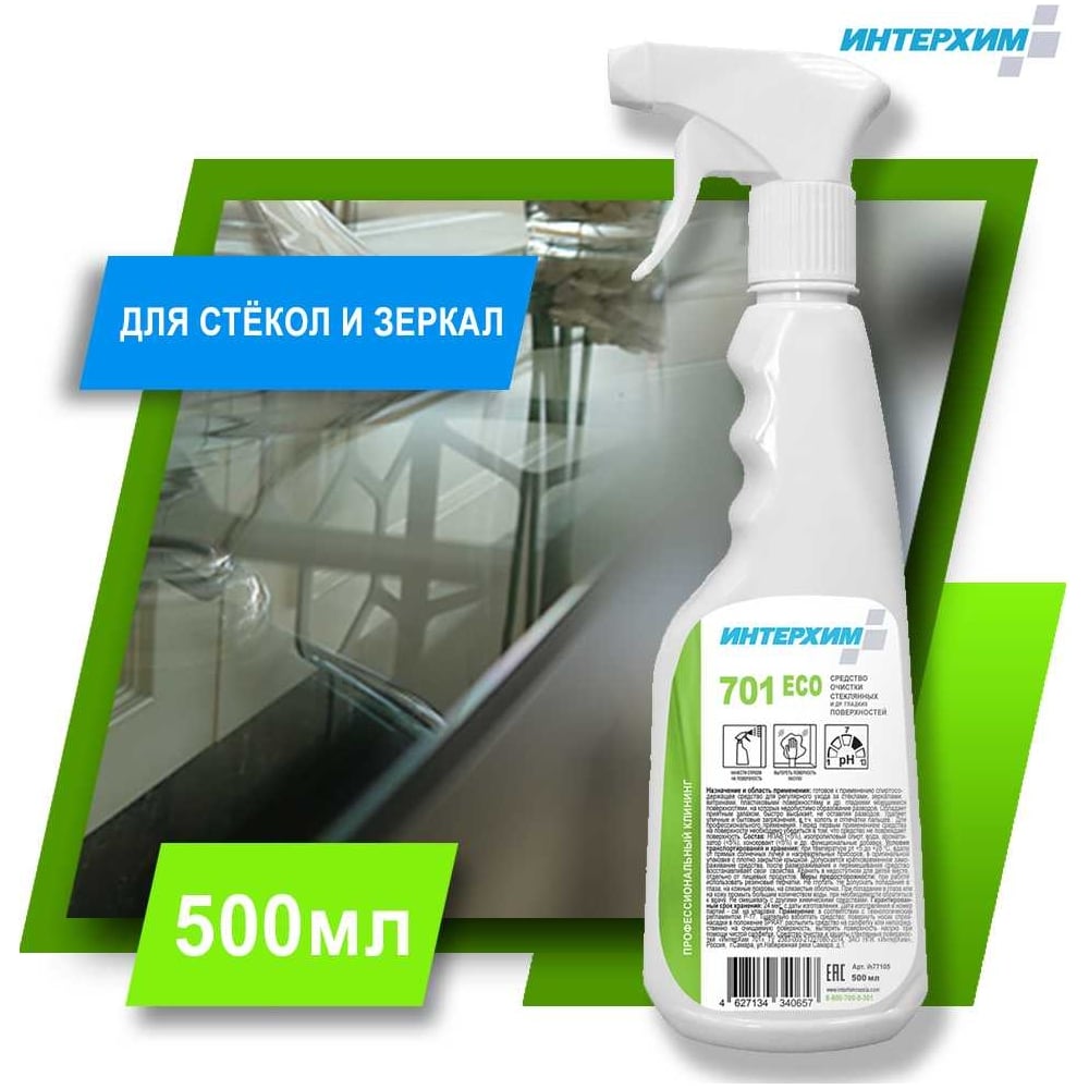 Средство очистки стеклянных и др. гладких поверхностей ИНТЕРХИМ 701 ECO 0.5 л, со спрей-насадкой ih77105