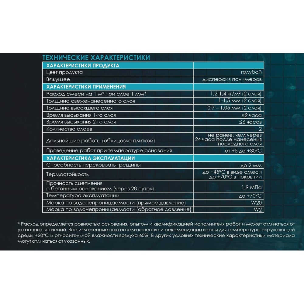 Применение для внутренних работ Цвет небесно-голубой Вес нетто 7 кг Назначение для гидроизоляции Защита от плесени да Состав Дисперсия стирол-акрилового сополимера Условия хранения Хранить в плотно закрытой таре в складских помещениях при температуре не ниже +10°С и не выше +35°С. Вид тары ведро Основа стирол-акриловая Рекомендуемое количество слоев 2 Способ нанесения кисть/валик Для кирпича да Для бетона да Для металла нет Для дерева нет Для камня нет Материал основания бетон/кирпич/штукатурка Для теплого пола да Тип продукта мастика Температура применения от +5 до +30 °С Толщина слоя 1-1,5 мм Держит прямое давление да Расход на один слой Расход смеси на 1 кв. м при слое 1 мм - 1,2-1,4 кг/кв.м (2 слоя)