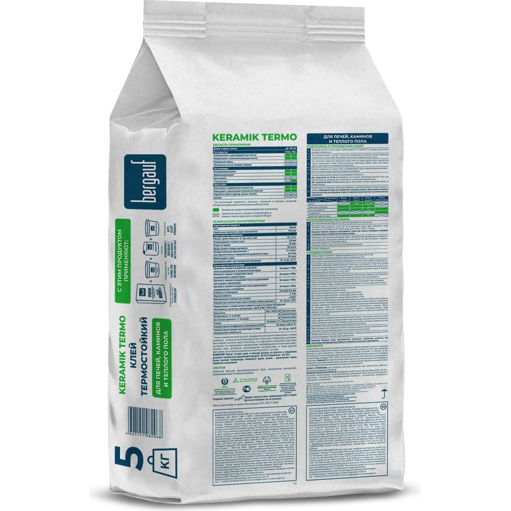 Термостойкий клей для печей, каминов и теплого пола Bergauf Keramik Termo класс C2TE, 5 кг 20732