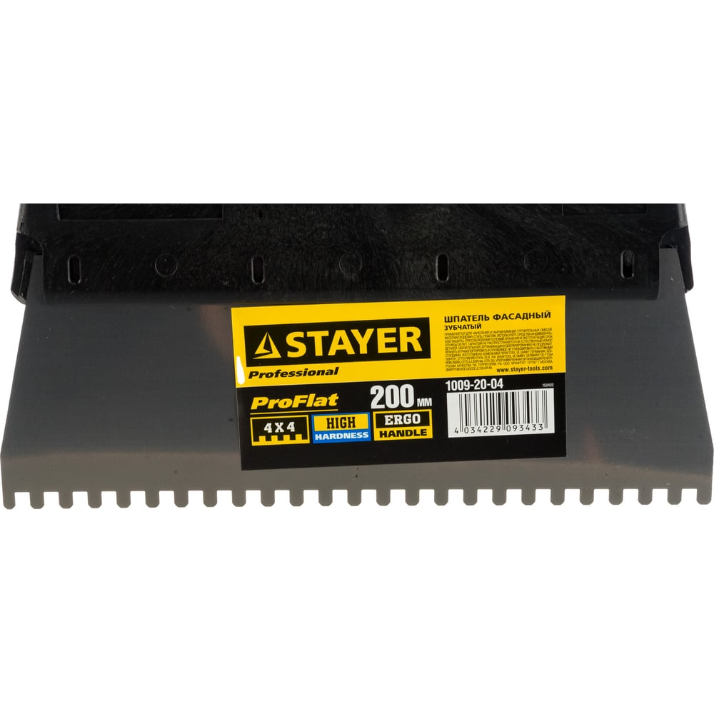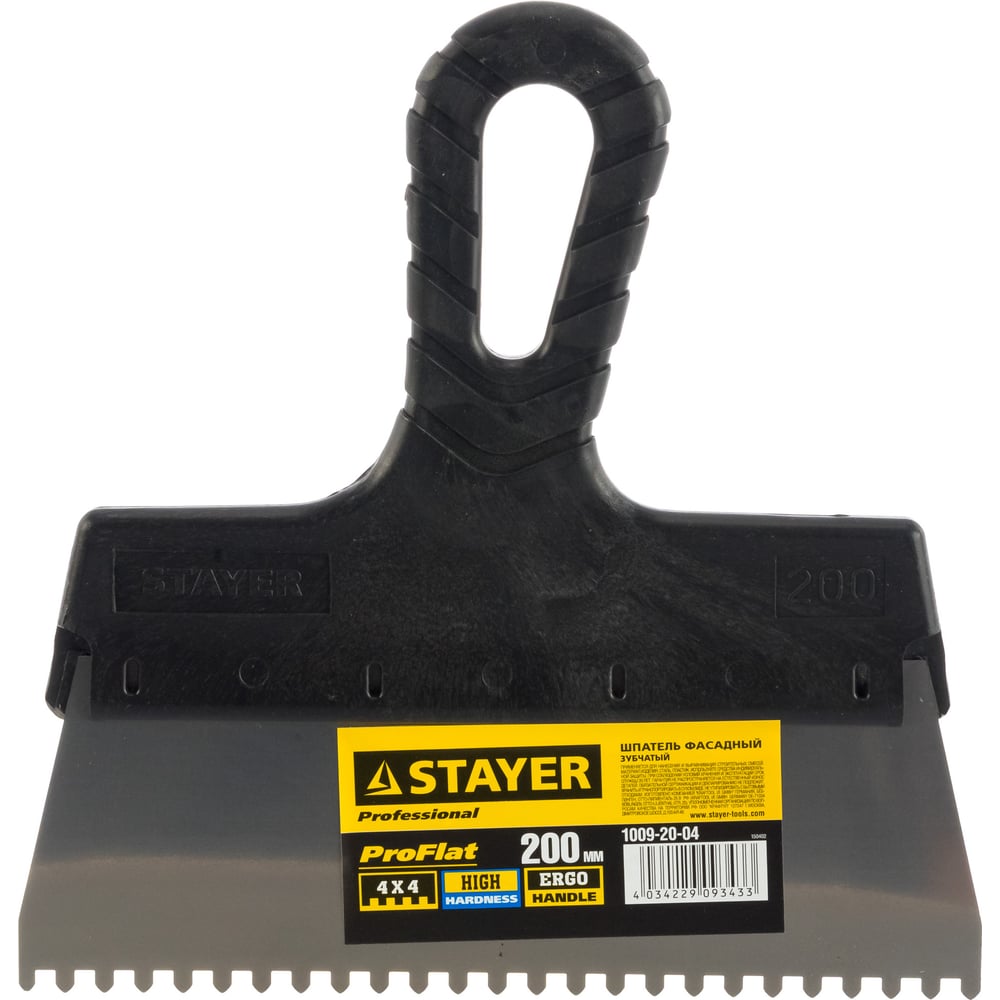 Нержавеющий зубчатый шпатель с пластмассовой ручкой, 200мм, зуб 4х4мм STAYER 1009-20-04