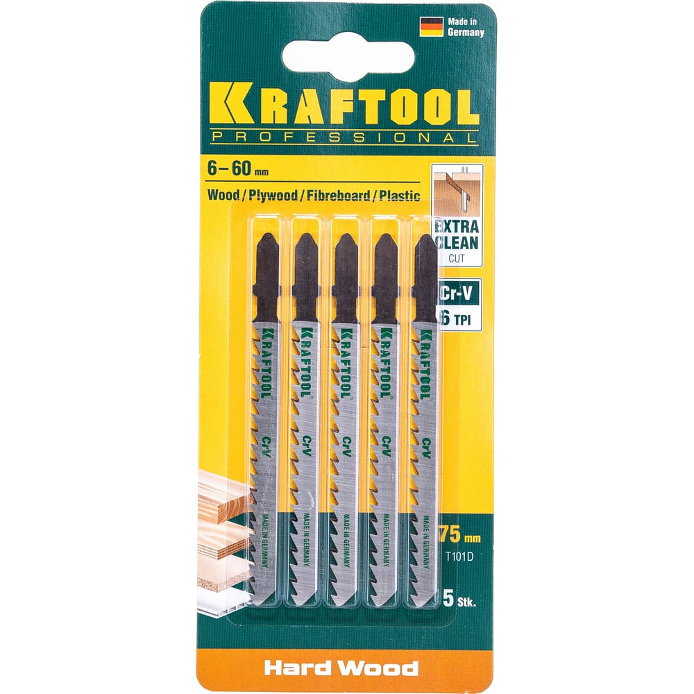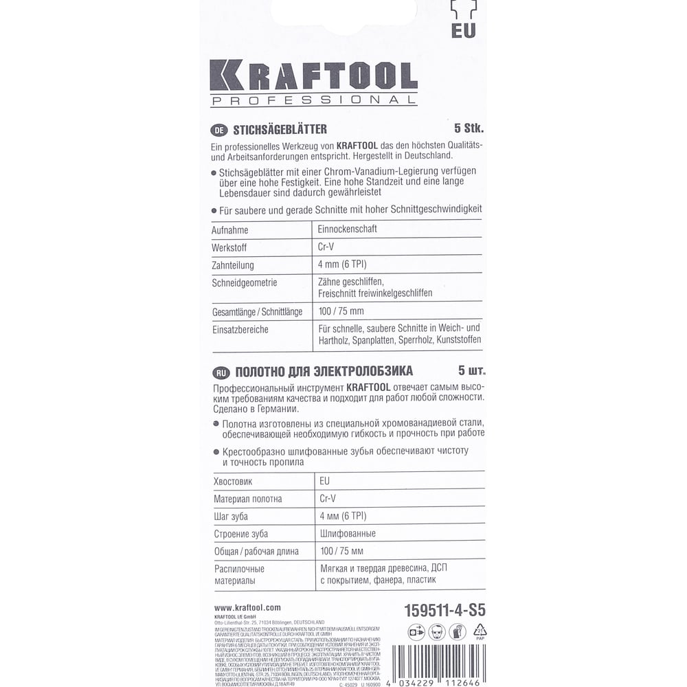 Пилки для электролобзика 5 шт. (Cr-V; чистый рез; EU-хвост.; шаг 4 мм, 75 мм) по дереву, ДСП, ДВП KRAFTOOL 159511-4-S5