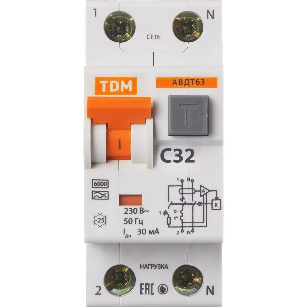 Автоматический выключатель дифференциального тока TDM ELECTRIC АВДТ 63 2P C32 30мА SQ0202-0005