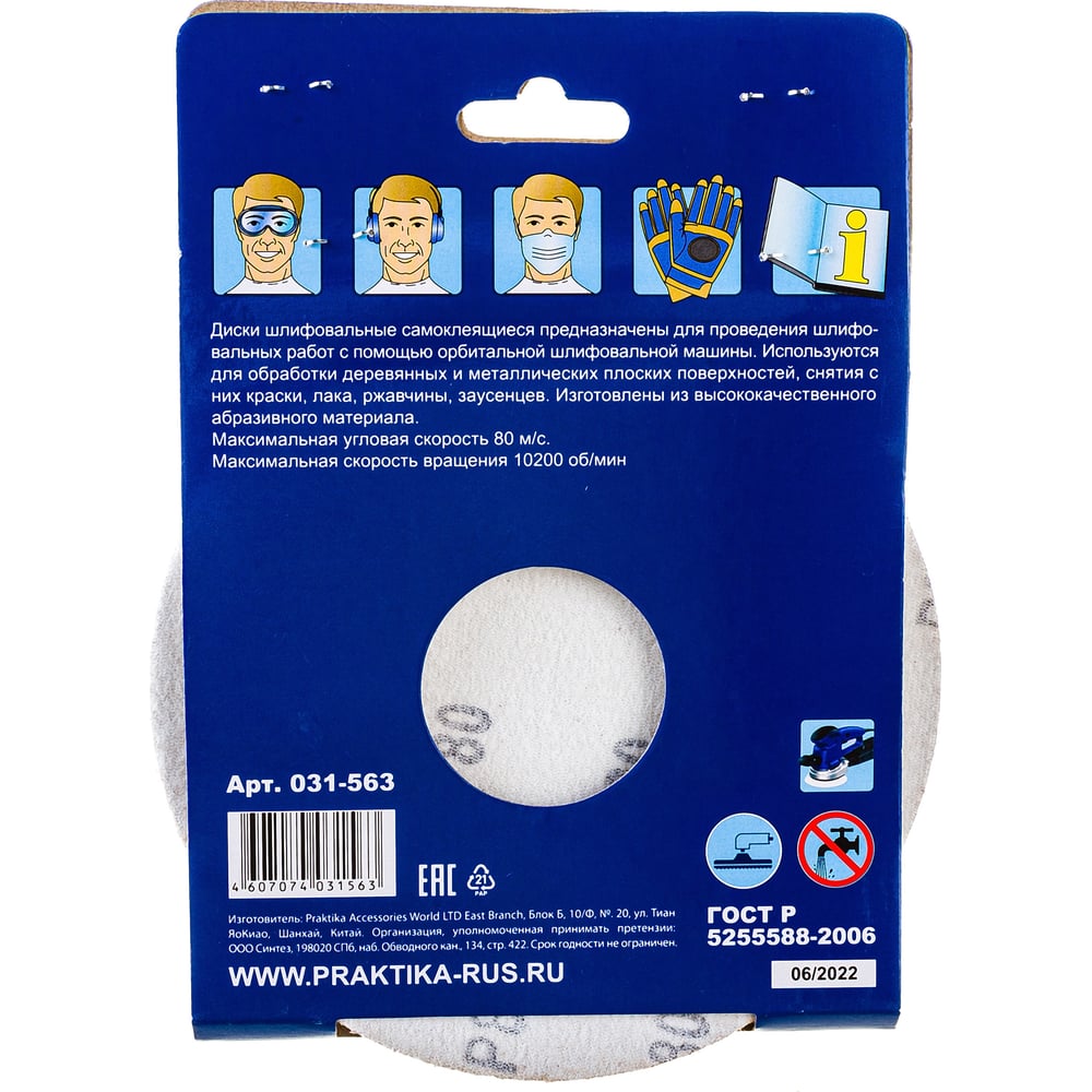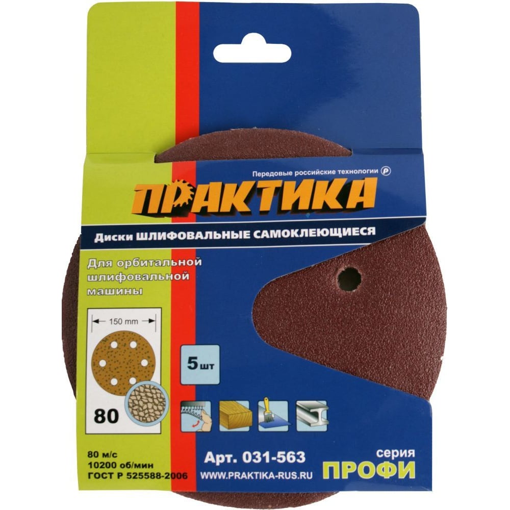 Круг шлифовальный на липкой основе (5шт; 150 мм; Р80) ПРАКТИКА 031-563