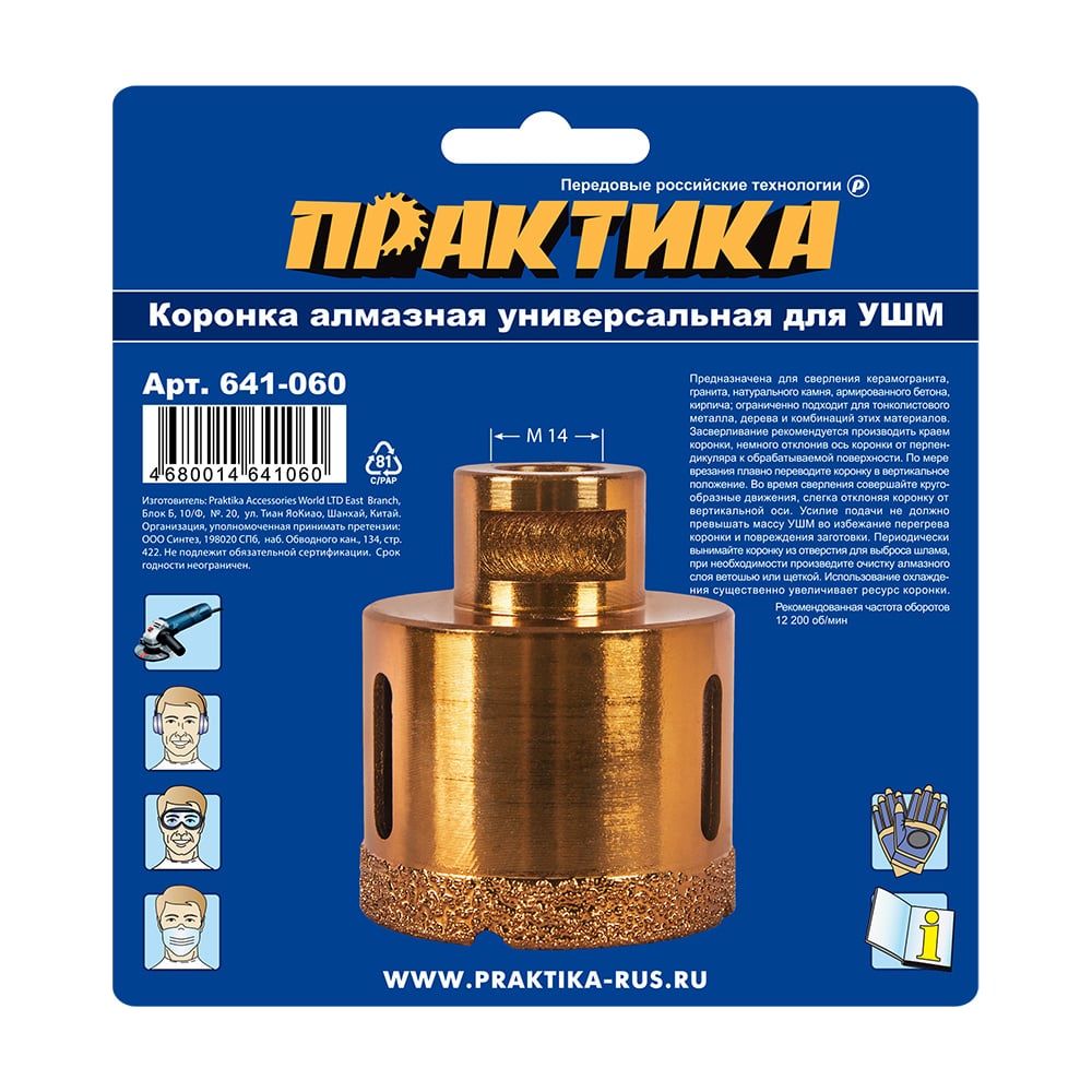 Универсальная алмазная коронка для УШМ ПРАКТИКА 641-060