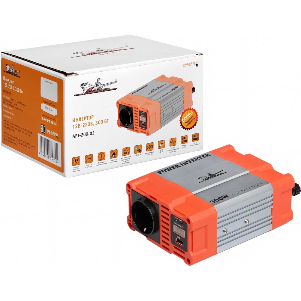 Инвертор Airline 12В-220В, 300 Вт API-200-02