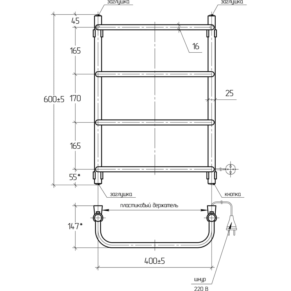 Электрический полотенцесушитель ТЕРА Мост 400х600 с греющим кабелем, 4 перекладины ПСН-12-01