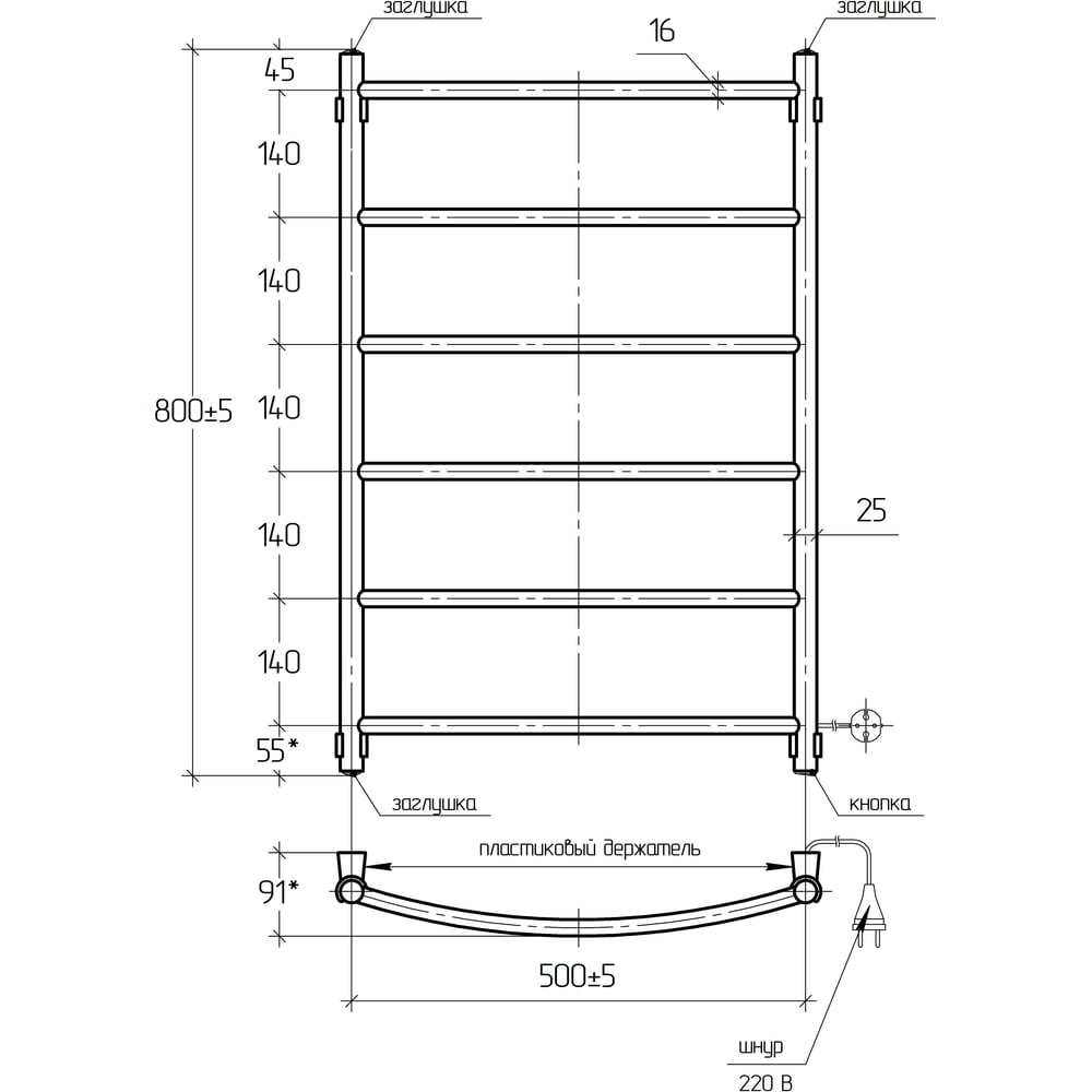 Электрический полотенцесушитель ТЕРА Ребро 500х800 с греющим кабелем, 6 перекладин ПСН-10-03