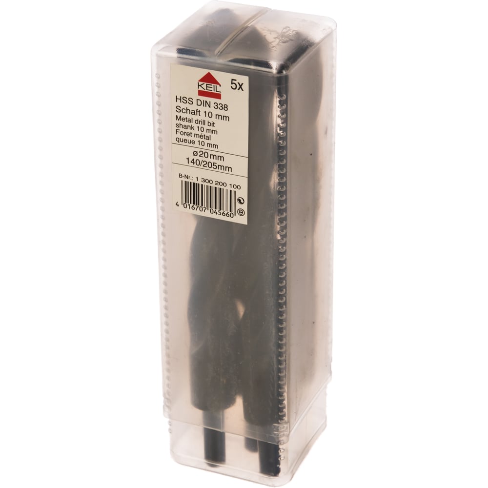 Сверла 5 шт. HSS DIN 338 проточенный хвостовик 10 мм, 20,0х205х140 мм KEIL 300200100