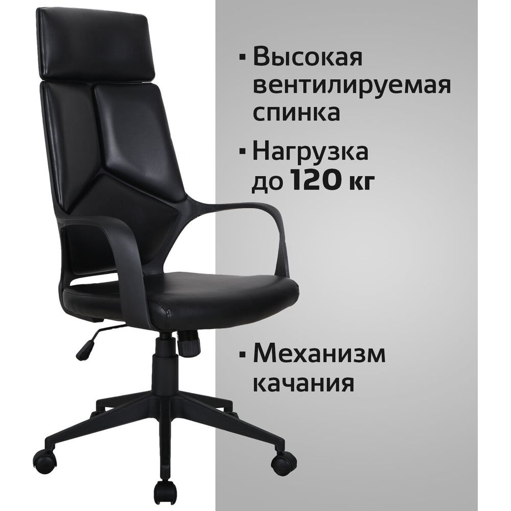 Габариты без упаковки 1270x630 мм Вес нетто 13.93 кг Стиль современный Регулировка высоты сиденья да Требует сборки да Подлокотники да Подъемный механизм да Механизм качания да Регулировка высоты спинки нет Регулировка высоты подлокотников нет Механизм вращения да Подголовник да Регулировка наклона спинки нет Подставка для ног нет Max нагрузка 120 кг Ширина сиденья 500 мм Глубина сиденья 470 мм Ширина спинки 460 мм Высота спинки 720 мм Min высота сиденья 485 мм Мах высота сиденья 585 мм Поясничный упор нет Цвет спинки черный Материал крестовины пластик Материал подлокотников пластик Цвет сиденья черный Материал обивки экокожа Колеса есть