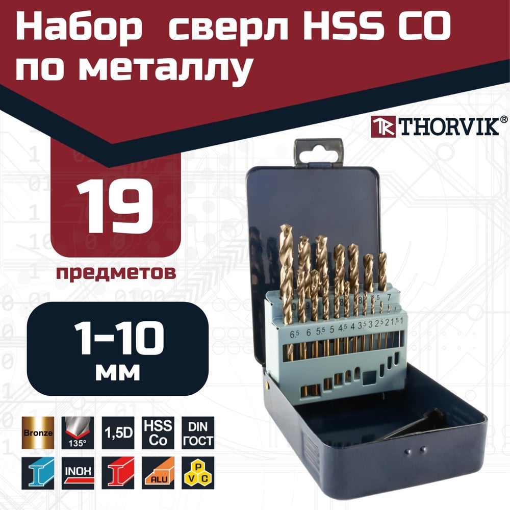 Набор спиральных сверл по металлу (19 шт, 1.0-10.0 мм, HSS Co) в металлическом кейсе Thorvik TDBS19K5 19 052898