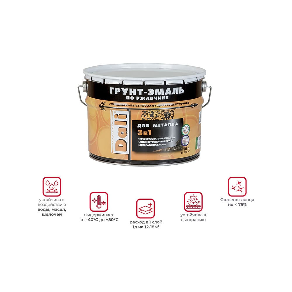 Грунт-эмаль по ржавчине Dali 3 в 1 молотковая зеленая RAL 6029 10 л 1 41758