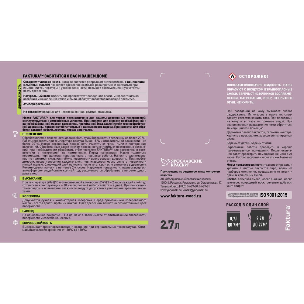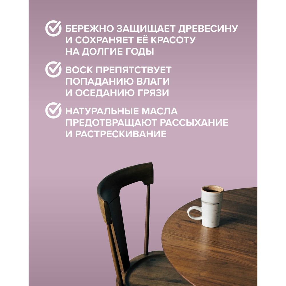 | Состав | алкидная смола, масло льняное, масло тунговое, природный воск, целевые добавки, уайт-спирит |