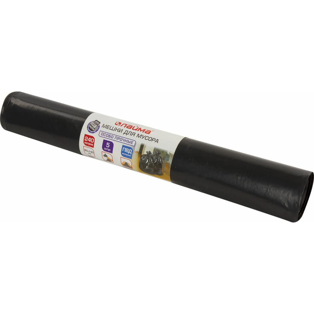 Мешки (5 шт; 240 л; 90х140 см; 80мкм; ПВД; черные; особо прочные) для мусора ЛАЙМА 605339