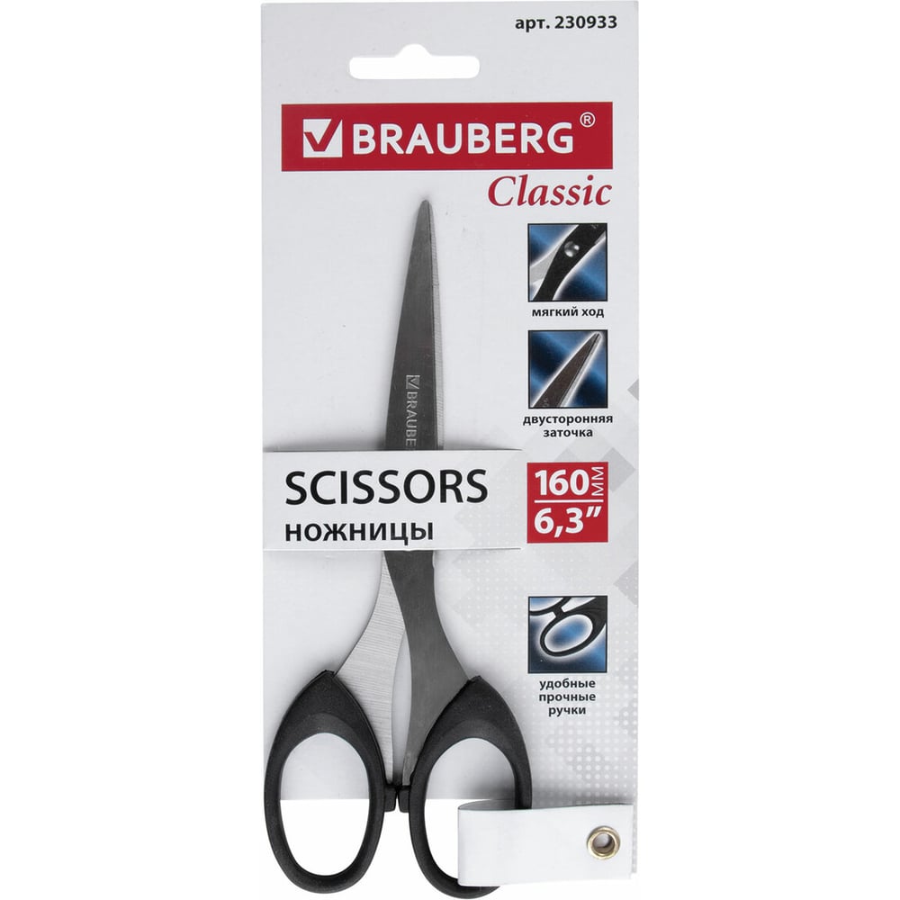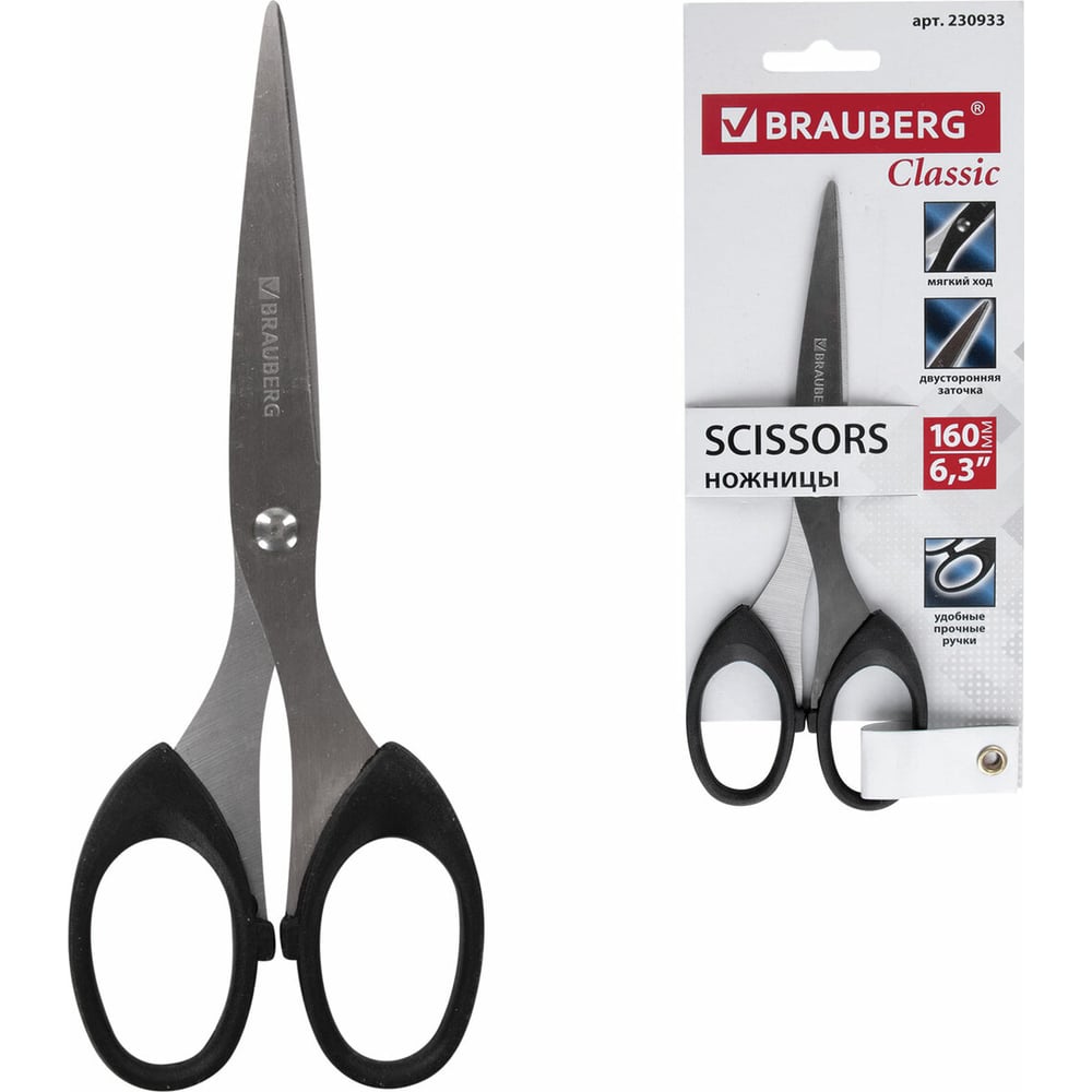 Ножницы BRAUBERG 160 мм, классической формы, чёрные, 2- х сторонняя заточка 230933