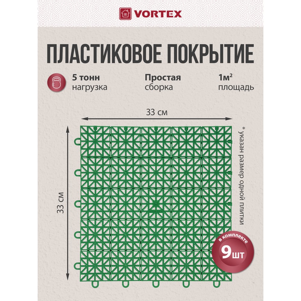 Универсальное пластиковое покрытие VORTEX 1 м2, 9 плиток, зеленое 05365