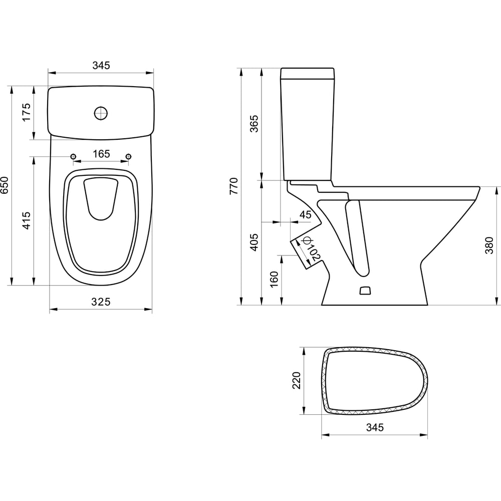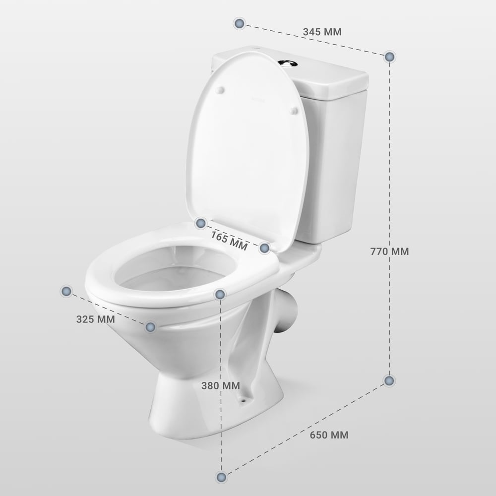 Цвет белый Тип напольный унитаз-компакт Стиль современный Серия ЛИГА Цвет фурнитуры хром Угловая конструкция нет Высота унитаза 770 мм Ширина унитаза 345 мм Материал унитаза фаянс Монтаж напольный Цвет сиденья белый Сиденье в комплекте да Подогрев сиденья нет Система антивсплеск нет Функция биде нет Тип выпуска косой Механизм слива воды механическая кнопка Безободковый нет Наличие микролифта нет Режим слива воды 2 кнопки Материал сиденья полипропилен Для детей нет Антибактериальное покрытие нет Для людей с ограниченными возможностями нет Бачок есть Высота чаши унитаза 390 мм Организация слива каскадный слив Подвод воды снизу бачка Быстросъемное сиденье нет Форма чаши овальная Объем смыва 3/6 л Max расстояние между креплениями 165 мм Min расстояние между креплениями 165 мм Глубина унитаза 650 мм Импульсный смыв нет