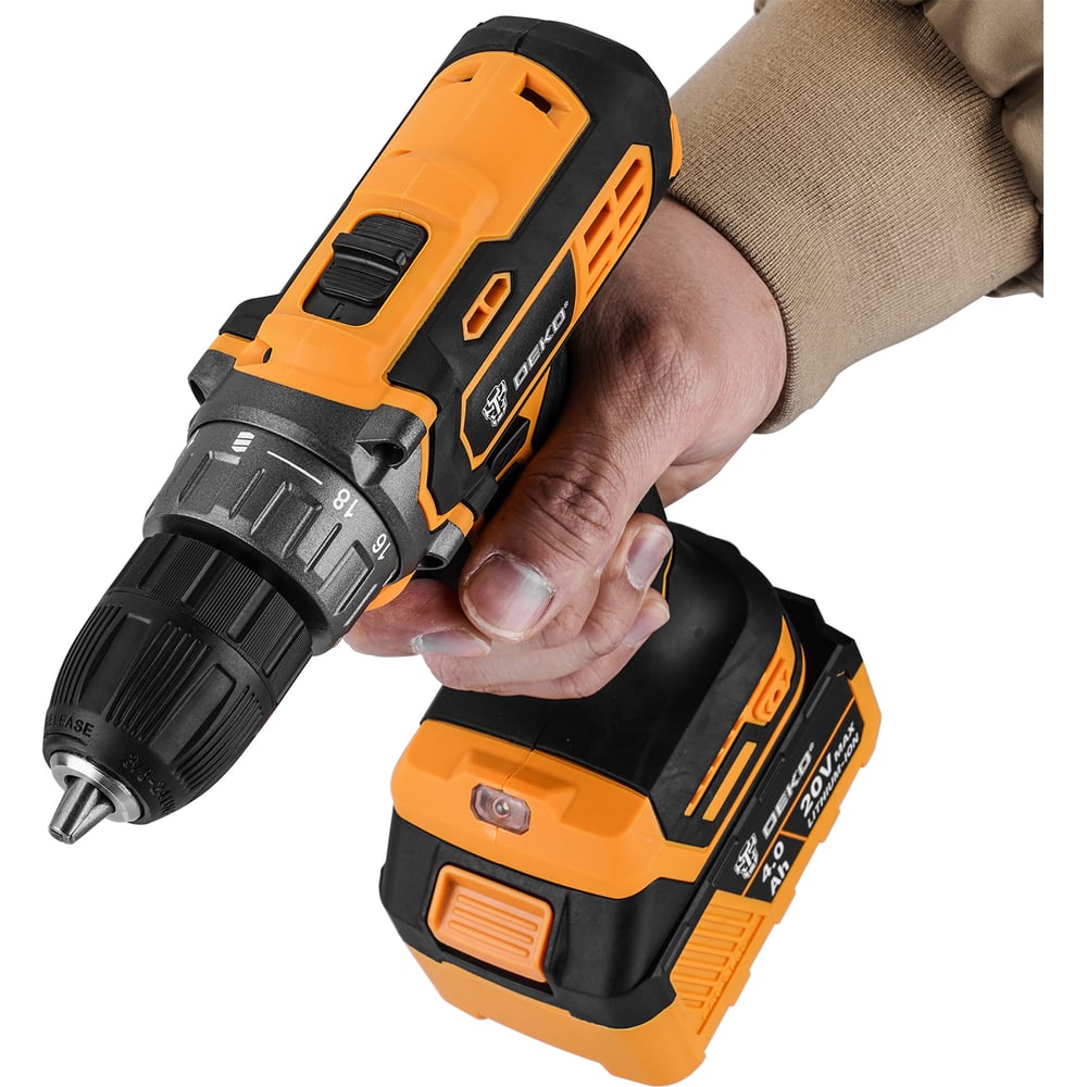 Набор инструмента DEKO: аккумуляторная дрель-шуруповерт DKCD20 + аккумуляторная угловая шлифмашина DKAG20-125 063-4204