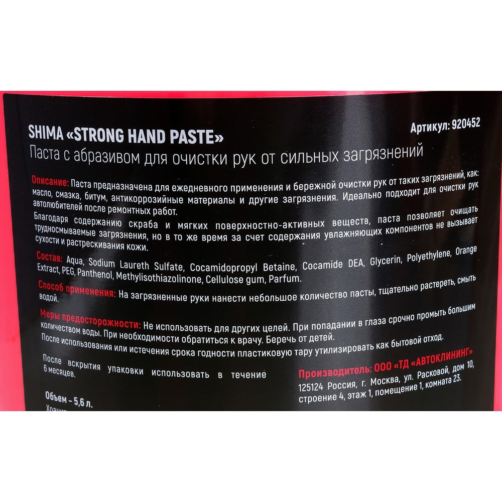 Паста с абразивом для очистки рук SHIMA DETAILER STRONG HAND PASTE 5.6 л 4603740920452 4610326361271