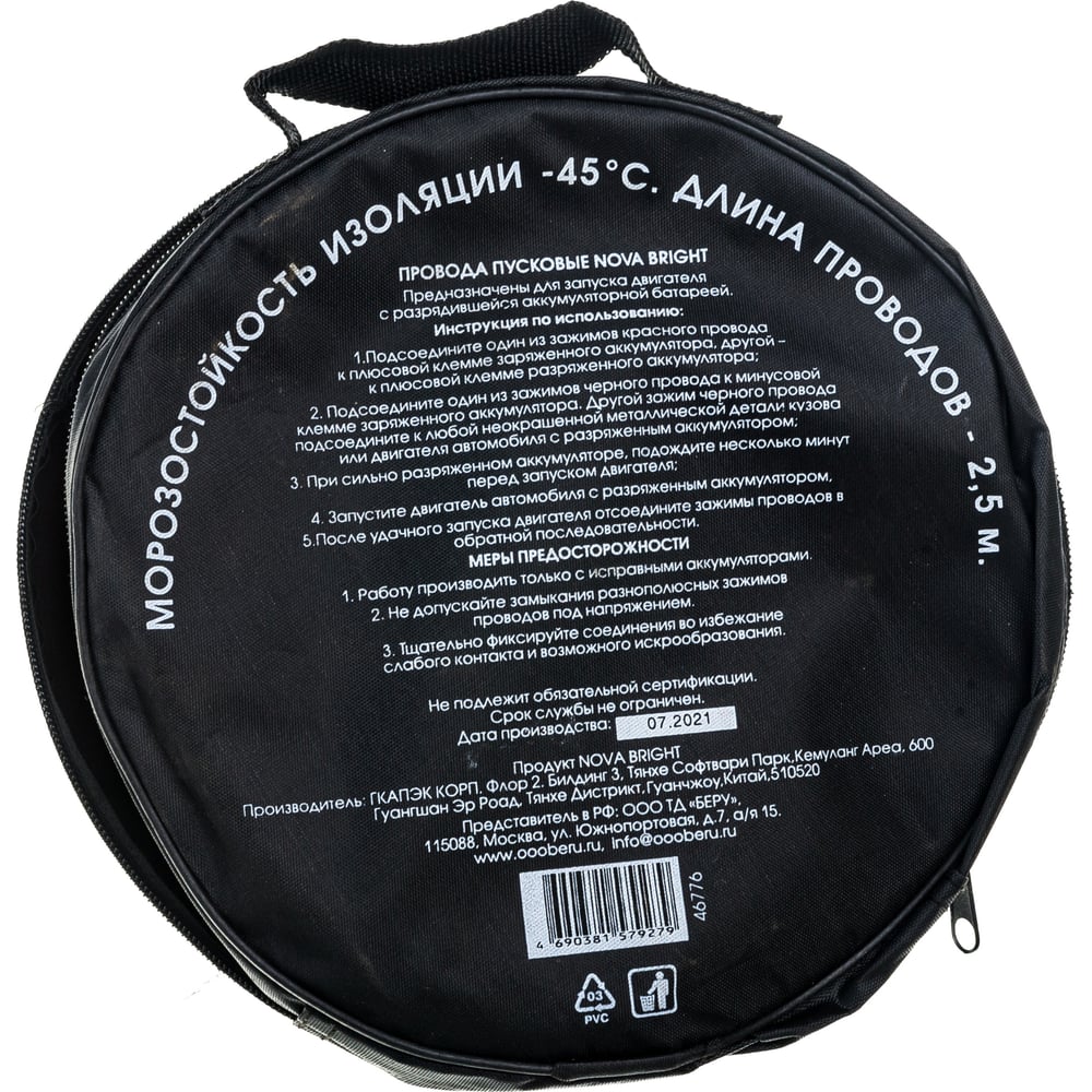 Пусковые провода Nova Bright 400 А, морозостойкие, в сумке, 2.5 м 46776