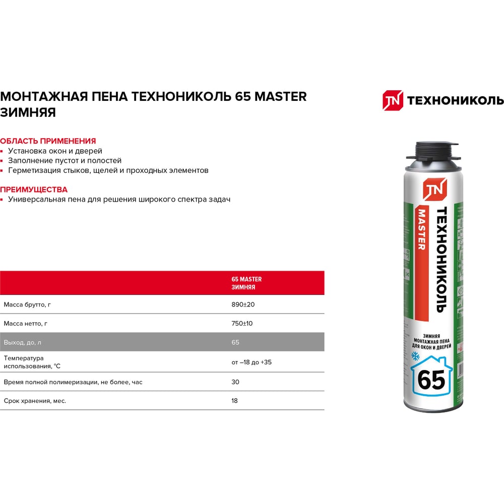| Объем пены в баллоне (выход) | 65 л |