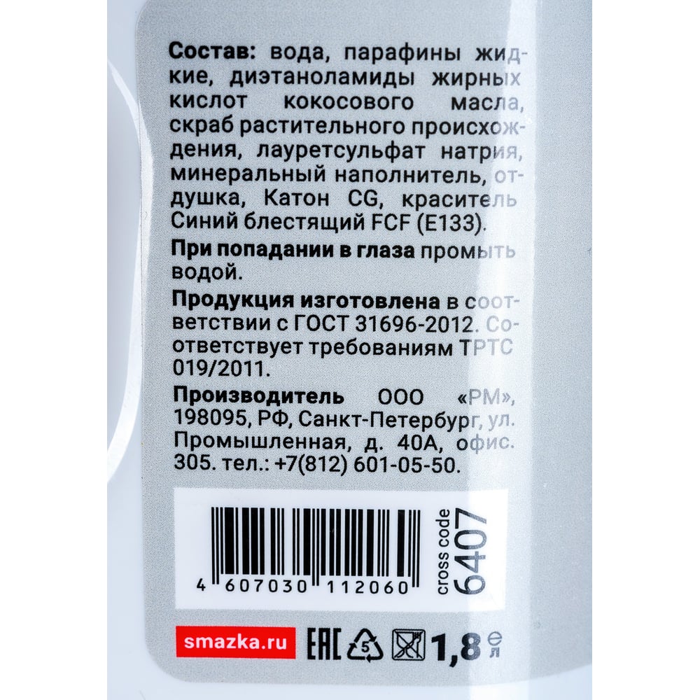 | Состав | вода, парафины жид- кие, диэтаноламиды жирных кислот кокосового масла, скраб растительного происхож- дения, лауретсульфат натрия, минеральный наполнитель, от- душка, Катон CG, краситель Синий блестящий FCF (Е133). |
