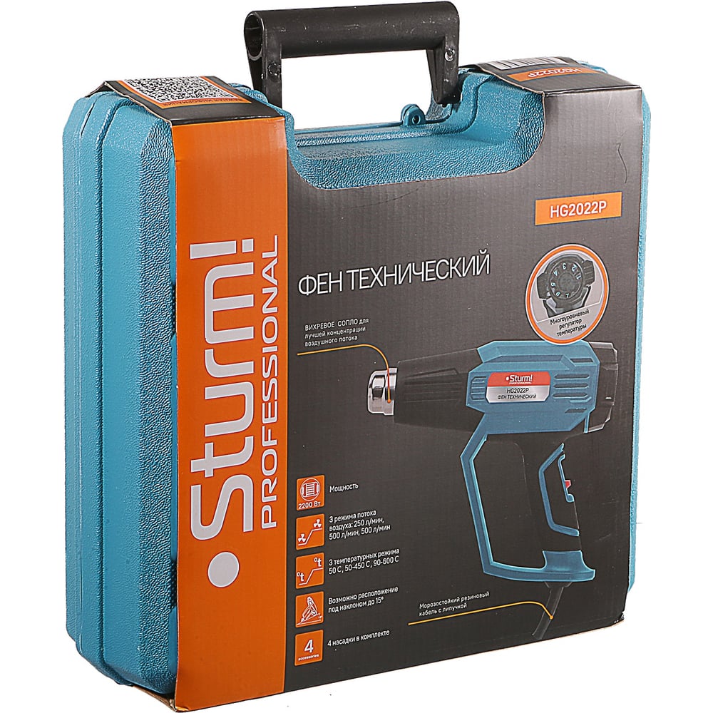 Технический фен Sturm 2200 Вт, 50/50-450/90-600C, 250/500/500л/мин, 4 насадки, кейс HG2022P