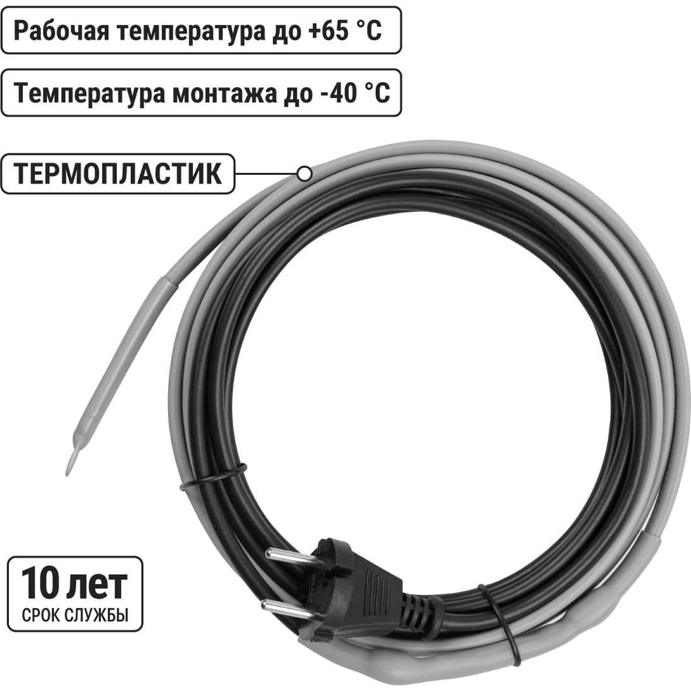 Применение для обогрева труб Цвет серый Вес нетто 0.61 кг Установка снаружи трубы Вилка в комплекте есть Напряжение 220 В Мощность 32 Вт Длина кабеля 2 м Max рабочая температура 65 °С Изоляция ПВХ Вид кабеля саморегулирующийся комплект без экрана Длина холодного кабеля 2 м Пищевой нет Функция саморегулирования теплоотдачи есть Общая длина кабеля 4 м Длина горячего кабеля 2 м Мин радиус изгиба при монтаже 60 мм Размер резьбы сальника 1/2 дюйм