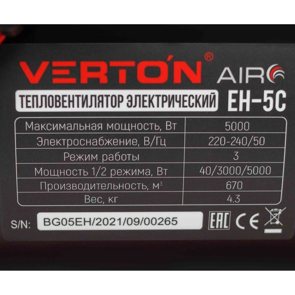 Электрический тепловентилятор VERTON Air EH-5C 01.5985.6763