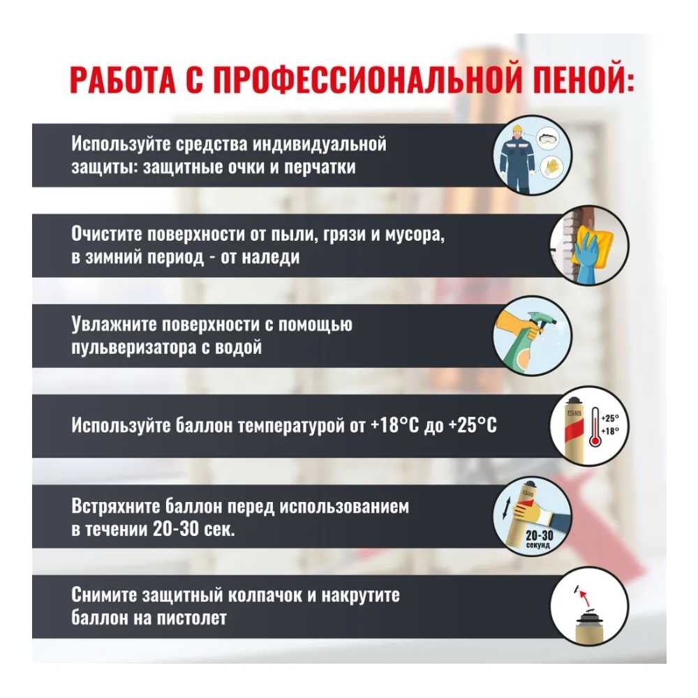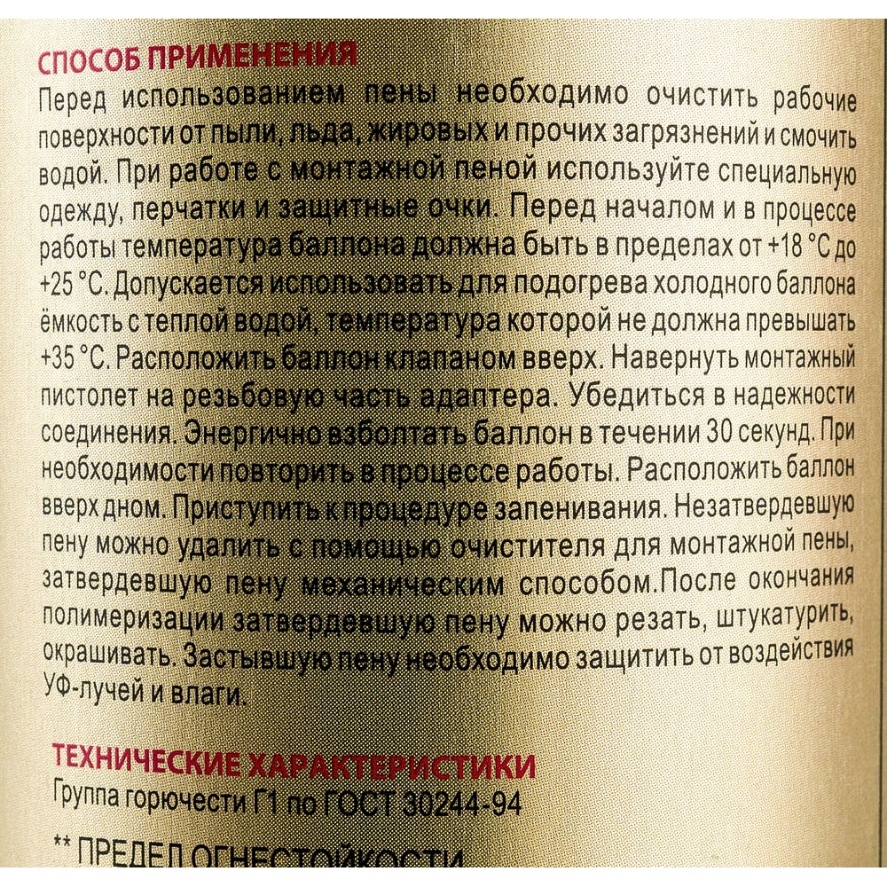 DIN нет Вес нетто 0.97 кг Вид тары баллон Количество в упаковке 1 шт Огнестойкость да Время полного застывания 24 ч Максимальная температура использования 30 °С Минимальная температура использования -5 °С Сезонность летняя Вид баллона под пистолет Коэффициент расширения 15-25% Время сопротивления высоким температурам 240 мин Цвет пены розовый Объем пены в баллоне (выход) 65 л Объем вещества в баллоне 850 мл Время на отлип 8 мин Время резки 40 мин Класс горючести В1 ГОСТ/ТУ ТУ BY 809000487.005-2014 Повышенная звукоизоляция да