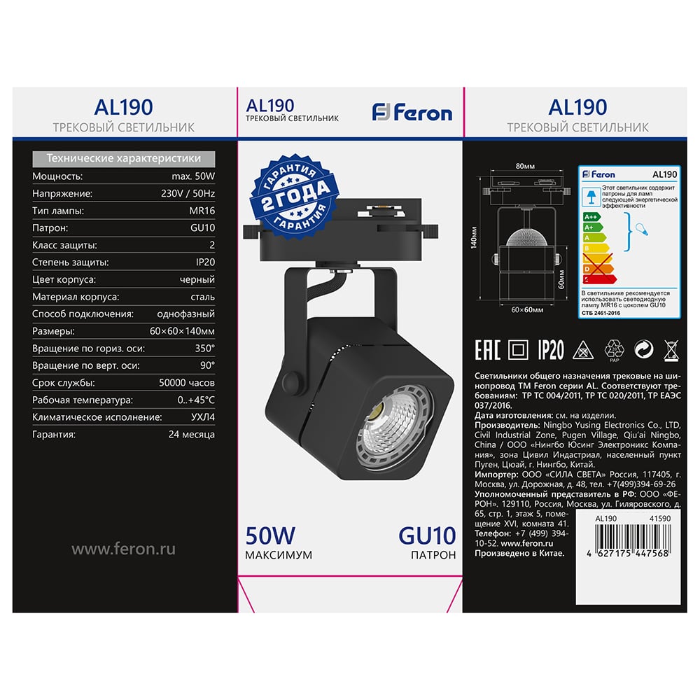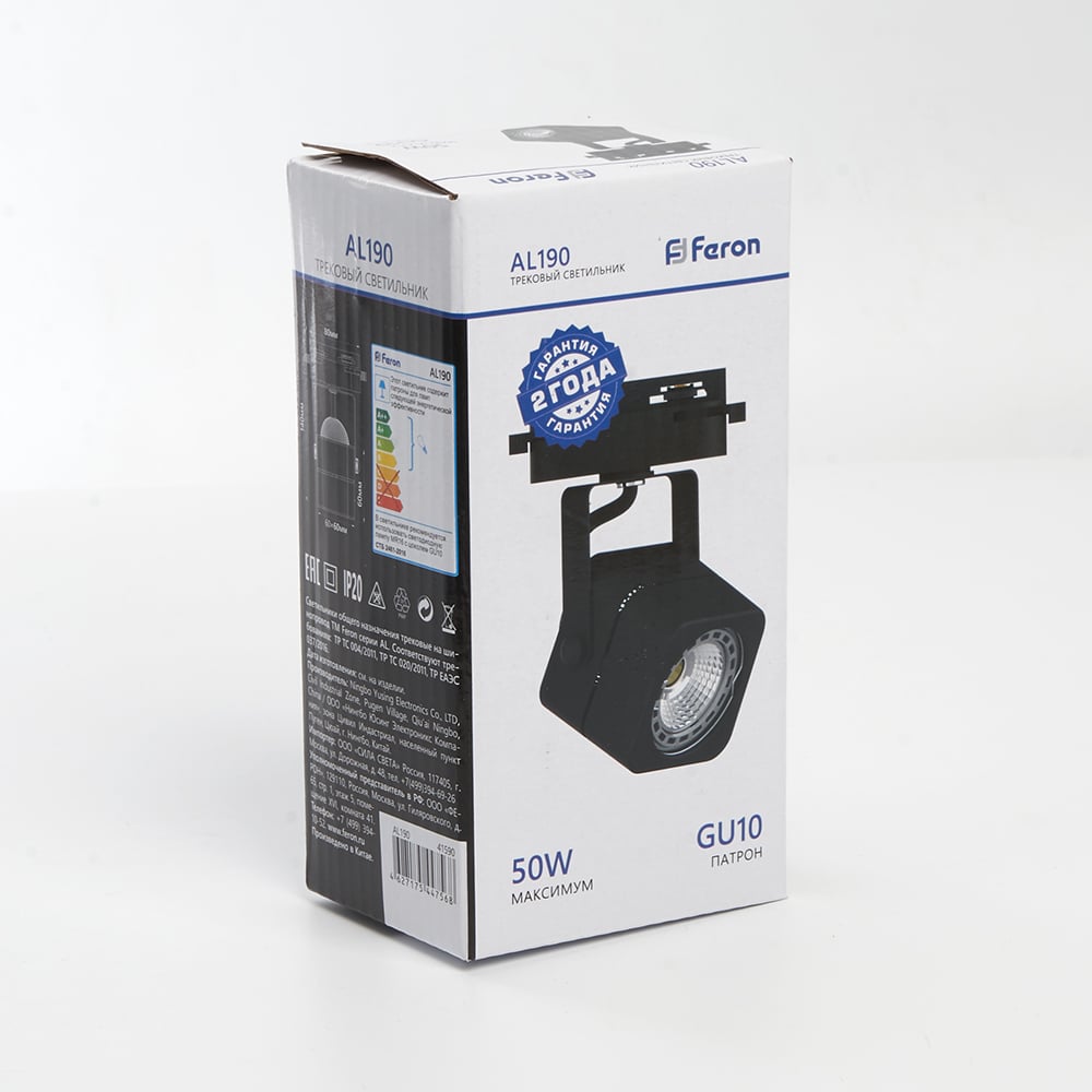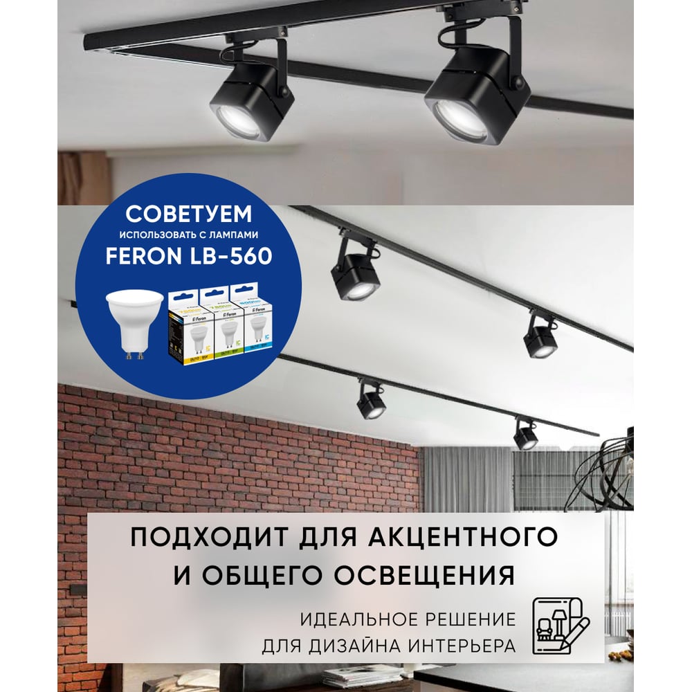 Трековый однофазный светильник на шинопровод FERON GU10, AL190, 50W, 230V, черный 41590