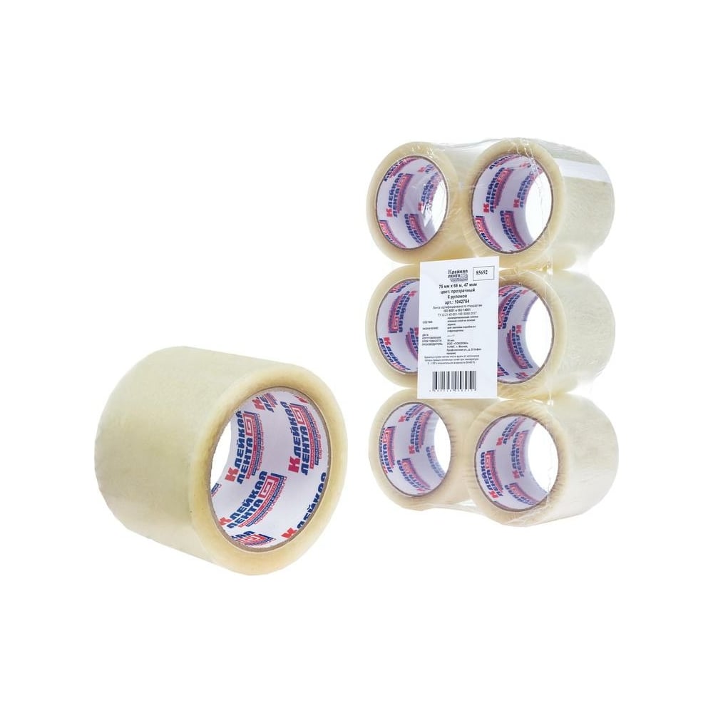 Упаковочная клейкая лента ООО Комус 75 мм х 66 м х 47 мкм, прозрачная, Россия, 6 шт./уп. 1042784
