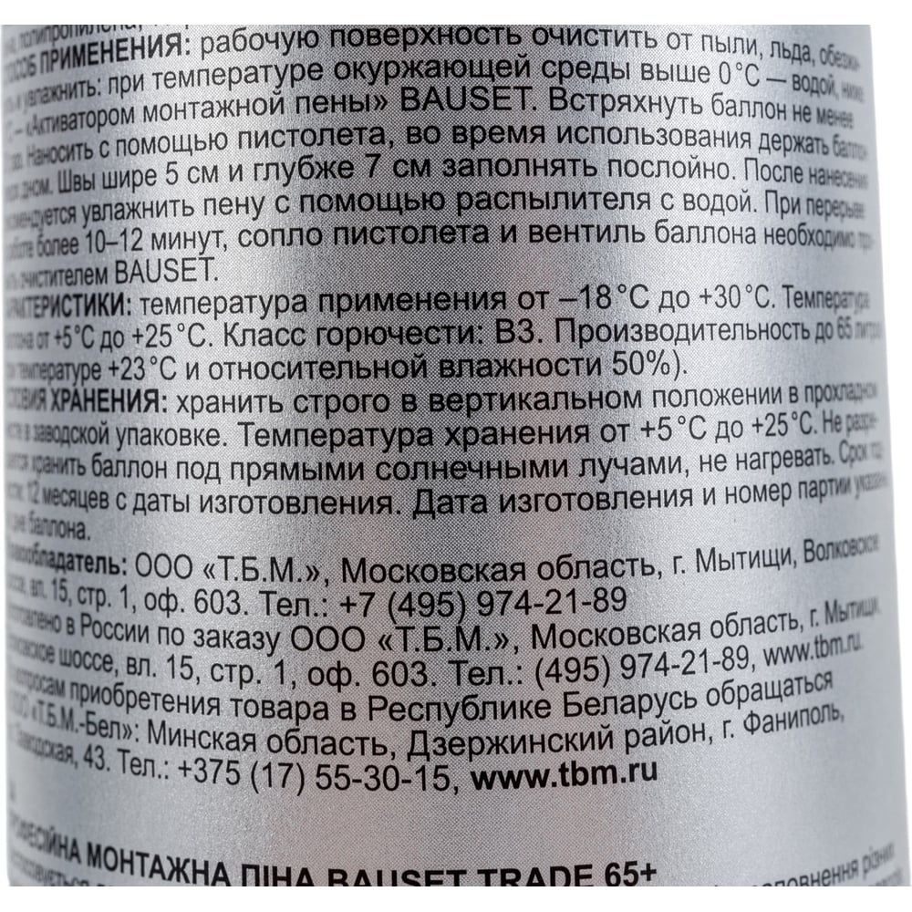 | Объем пены в баллоне (выход) | 65 л |