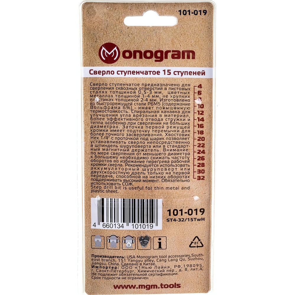 Сверло ступенчатое спиральное по металлу Special (4-32 мм; 15 ступеней; Р6М5) Monogram 101-019