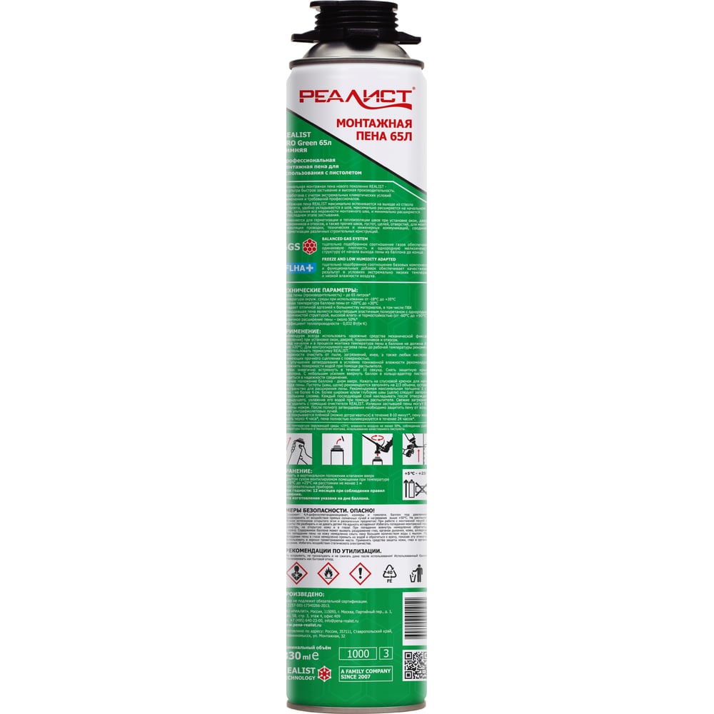 Пена монтажная REALIST PRO Green 65 л, зимняя 4602009041051