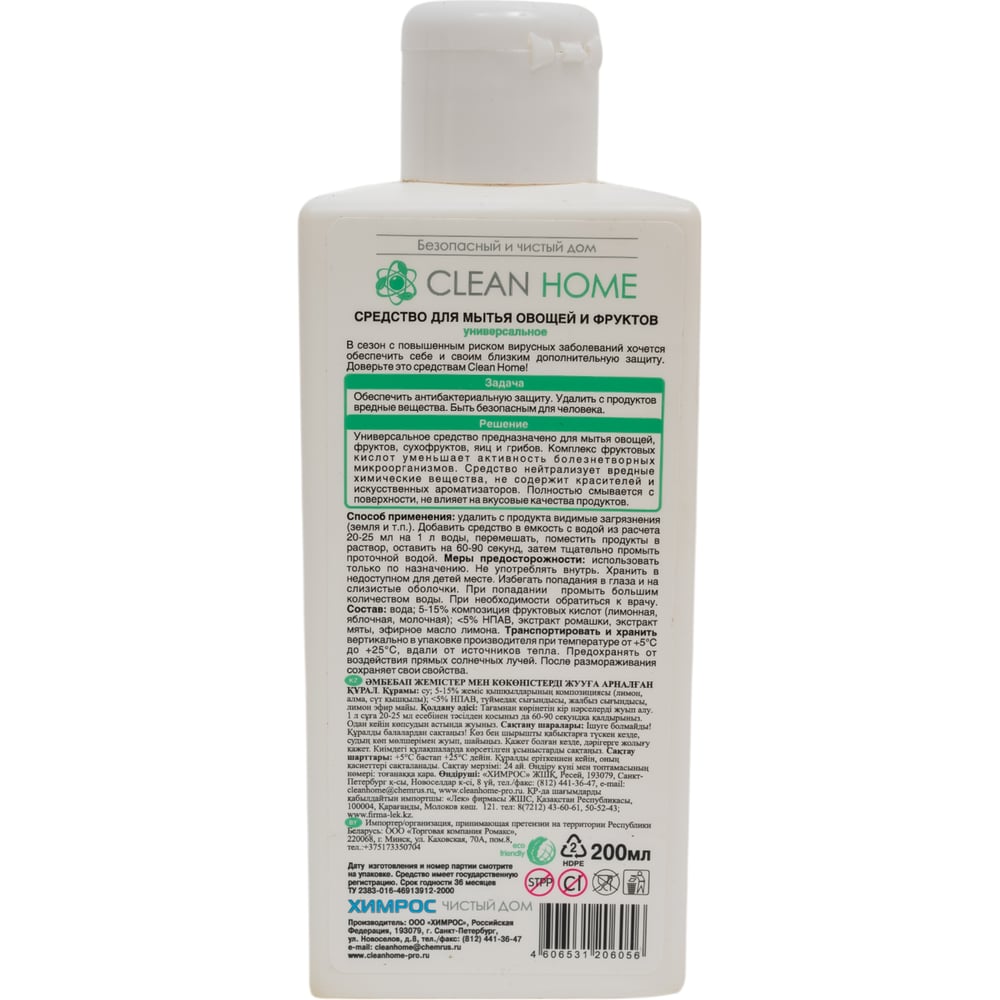 Средство для мытья для овощей и фруктов CLEAN HOME 200 мл 530