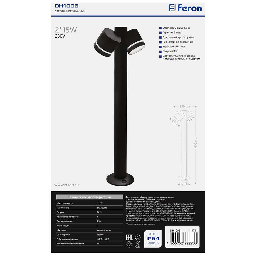 Садово-парковый светильник FERON DH1006, столб, 2хGX53 230V, черный, 11711