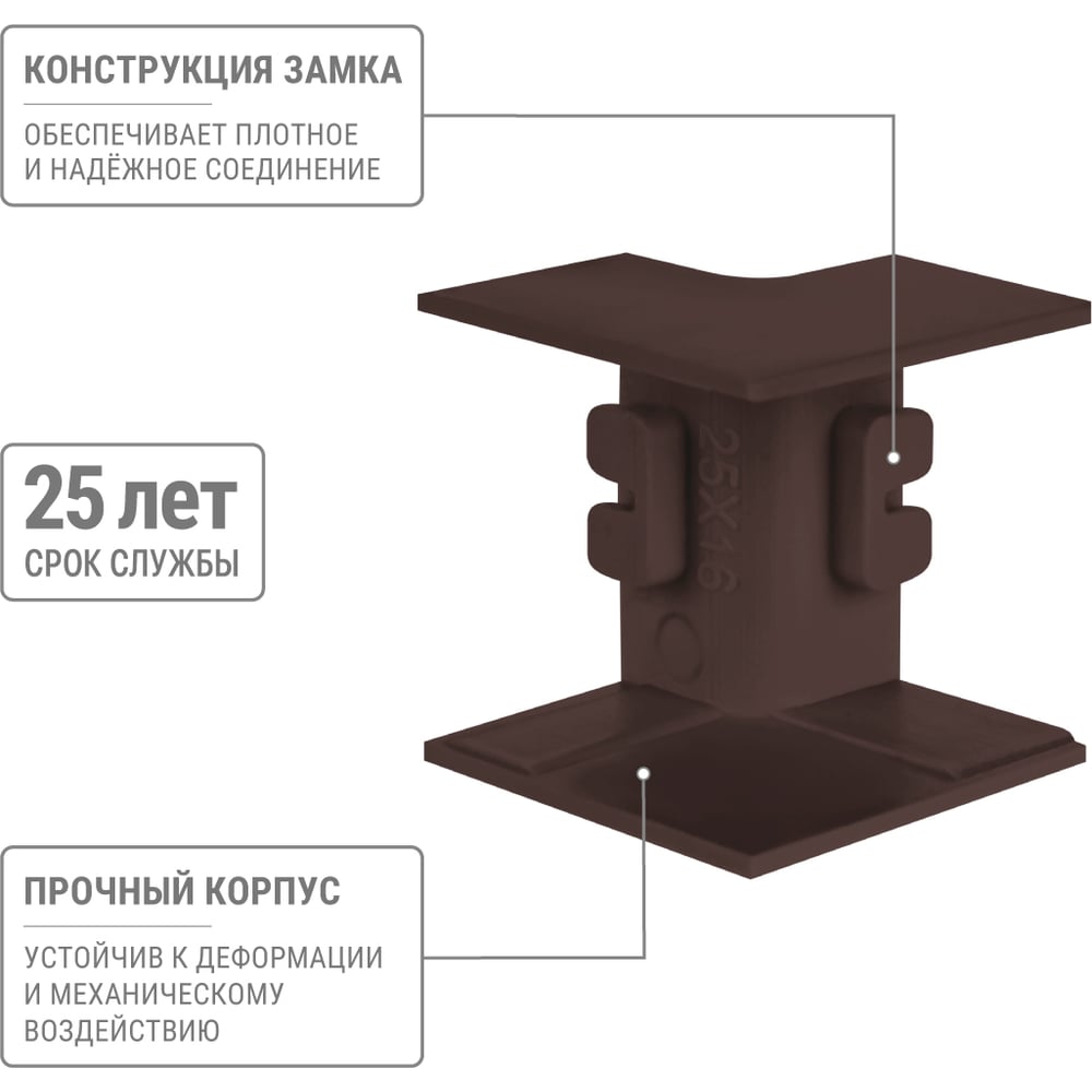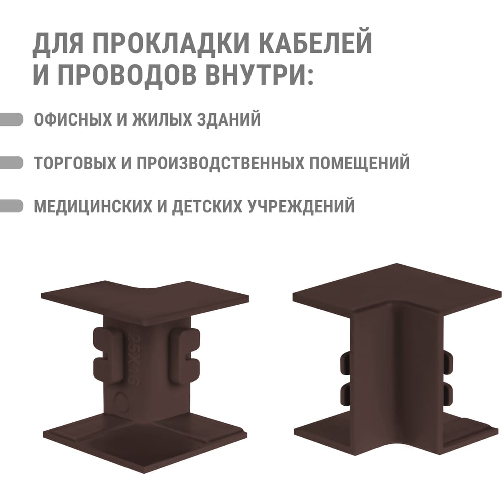 Высота 16 мм Длина 50 мм Материал ПВХ Ширина 25 мм Цвет бук Тип внутренний угол Вес нетто 0.02 кг Степень защиты IP40 Количество в упаковке 4 шт Температура эксплуатации от -40 до +70 °С Цвет RAL 8022 Палитра коричневый Температура монтажа от -15 до +60 °С Климатическое исполнение УХЛ1 Размер 25х16 мм Количество вводов 2 шт Высота кабель-канала 16 мм Ширина кабель-канала 25 мм Количество отсеков 1 шт Изменяемый угол нет