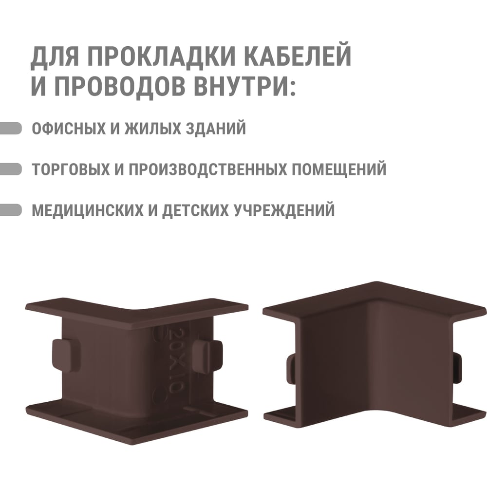Высота 10 мм Длина 40 мм Материал ПВХ Ширина 20 мм Цвет бук Тип внутренний угол Вес нетто 0.022 кг Степень защиты IP40 Количество в упаковке 4 шт Температура эксплуатации от -40 до +70 °С Цвет RAL 8022 Палитра коричневый Температура монтажа от -15 до +60 °С Климатическое исполнение УХЛ1 Размер 20х10 мм Количество вводов 2 шт Высота кабель-канала 10 мм Ширина кабель-канала 20 мм Количество отсеков 1 шт Изменяемый угол нет