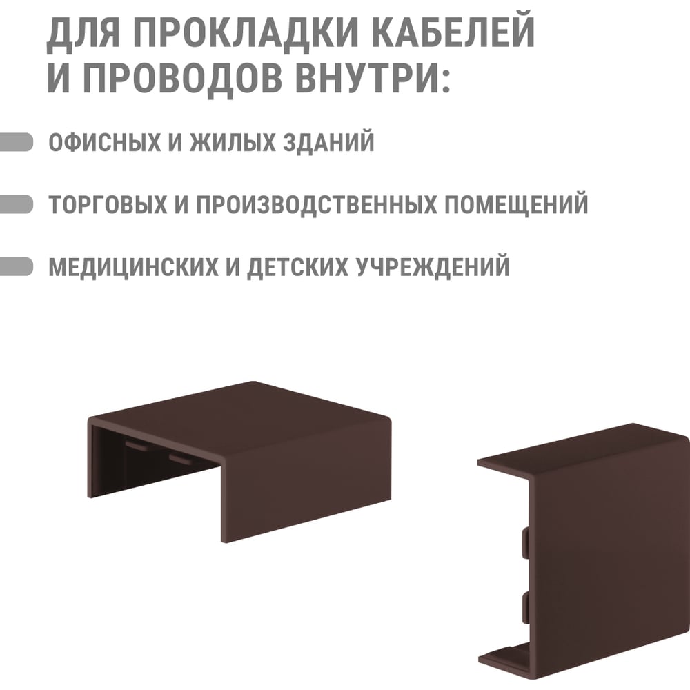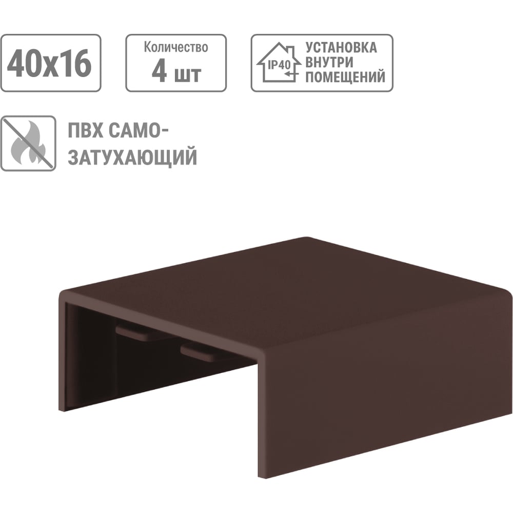 Высота 16 мм Длина 80 мм Материал ПВХ Ширина 40 мм Цвет бук Вес нетто 0.02 кг Степень защиты IP40 Количество в упаковке 4 шт Температура эксплуатации от -40 до +70 °С Цвет RAL 8022 Температура монтажа от -15 до +60 °С Климатическое исполнение УХЛ1 Высота кабель-канала 16 мм Ширина кабель-канала 40 мм