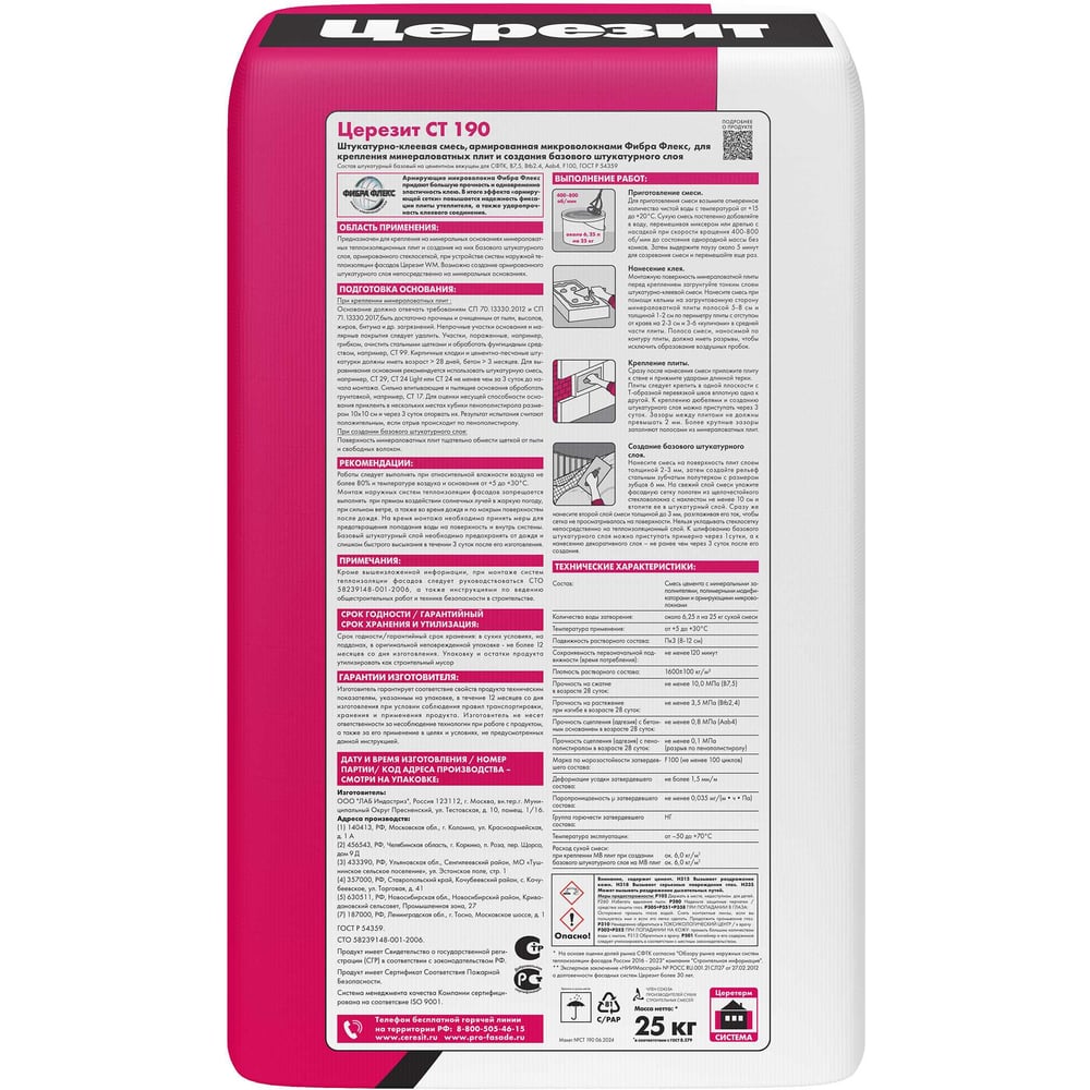Клей для плит из минеральной ваты Церезит CT 190, 25 кг, Россия, зима, 1604016